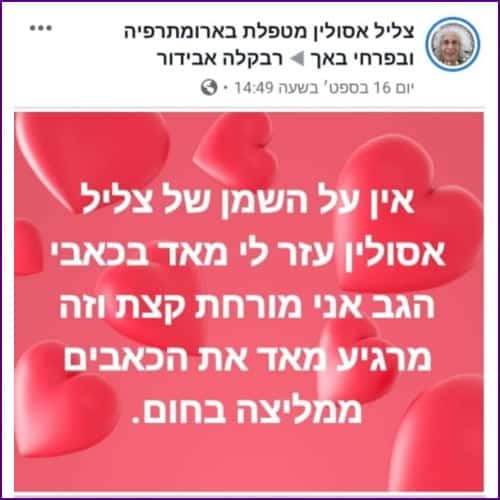 "מורחת את המשחה על כאבים בברכיים ובקרסוליים, בכל מקום שיש לי כאבים - עובד מצויין!" בת שבע נ."