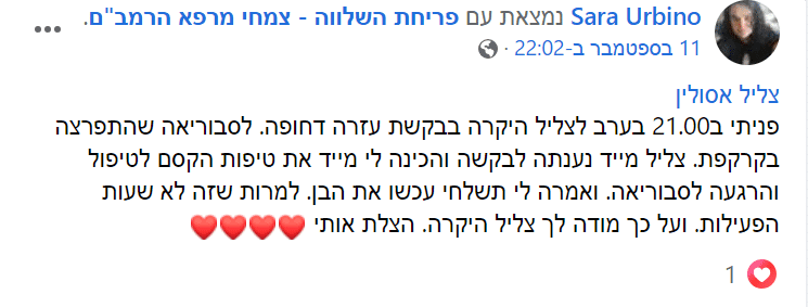 פניתי ב21.00 בערב לצליל היקרה בבקשת עזרה דחופה. לסבוריאה שהתפרצה בקרקפת. צליל מייד נענתה לבקשה והכינה לי מייד את טיפות הקסם לטיפול והרגעה לסבוריאה. ואמרה לי תשלחי עכשו את הבן. למרות שזה לא שעות הפעילות. ועל כך מודה לך צליל היקרה. הצלת אותי ❤️❤️❤️❤️