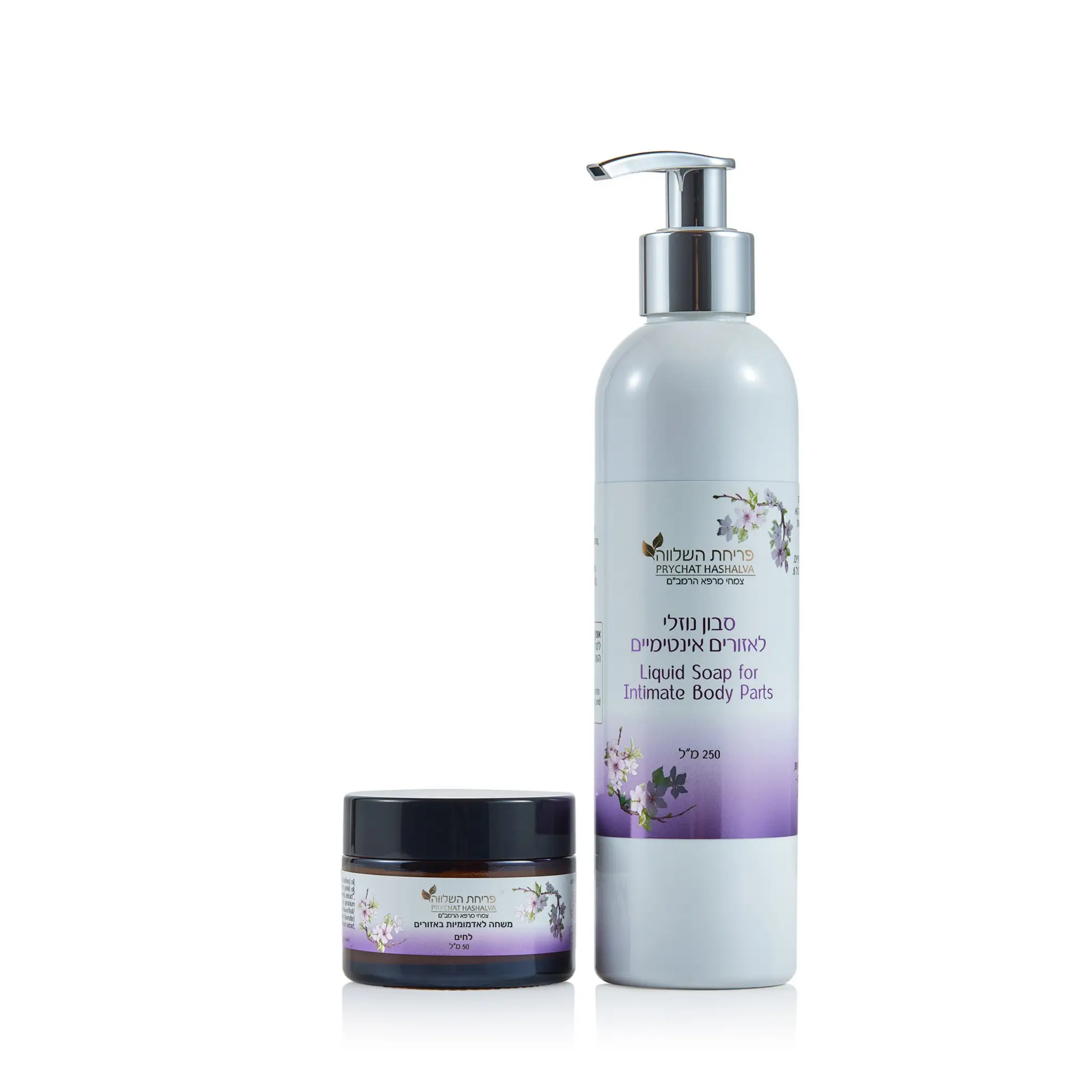ערכה לאזורים אינטימיים – מרכיבים טבעיים עדינים, המשחה והסבון האינטימיים לשטיפה אינטימית, מסייעים בשמירה על ניקיון, איזון לחות, רעננות לריחות לא נעימים, תוך הזנה והגנה טבעית של העור והיגיינה יומיומית.