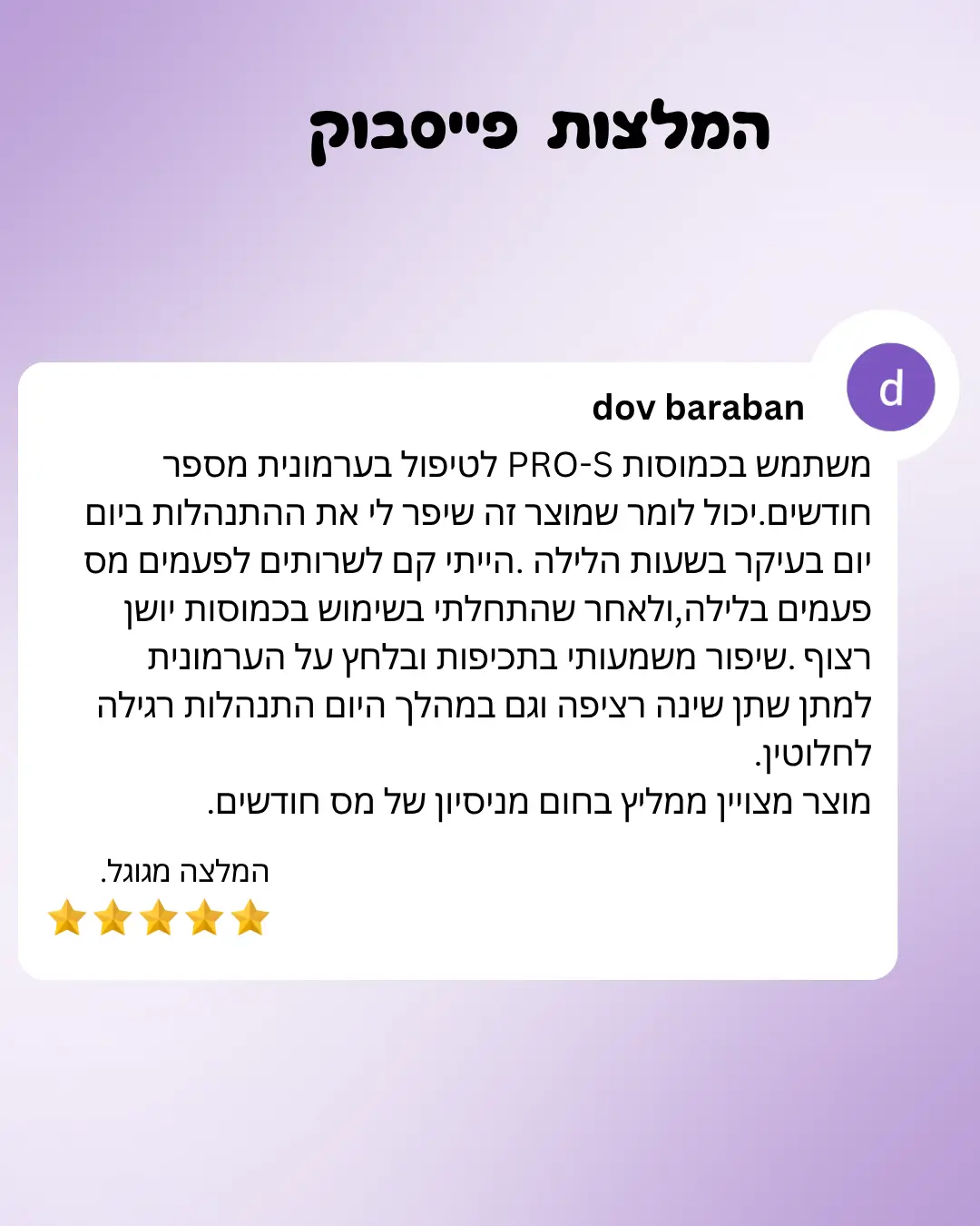 קמתי 4–5 פעמים בלילה לשירותים זה גמר אותי הקפסולות עזרו לי לישון רצוף ויש שיפור עצום בתכיפות ממליץ לכל גבר מעל גיל 50