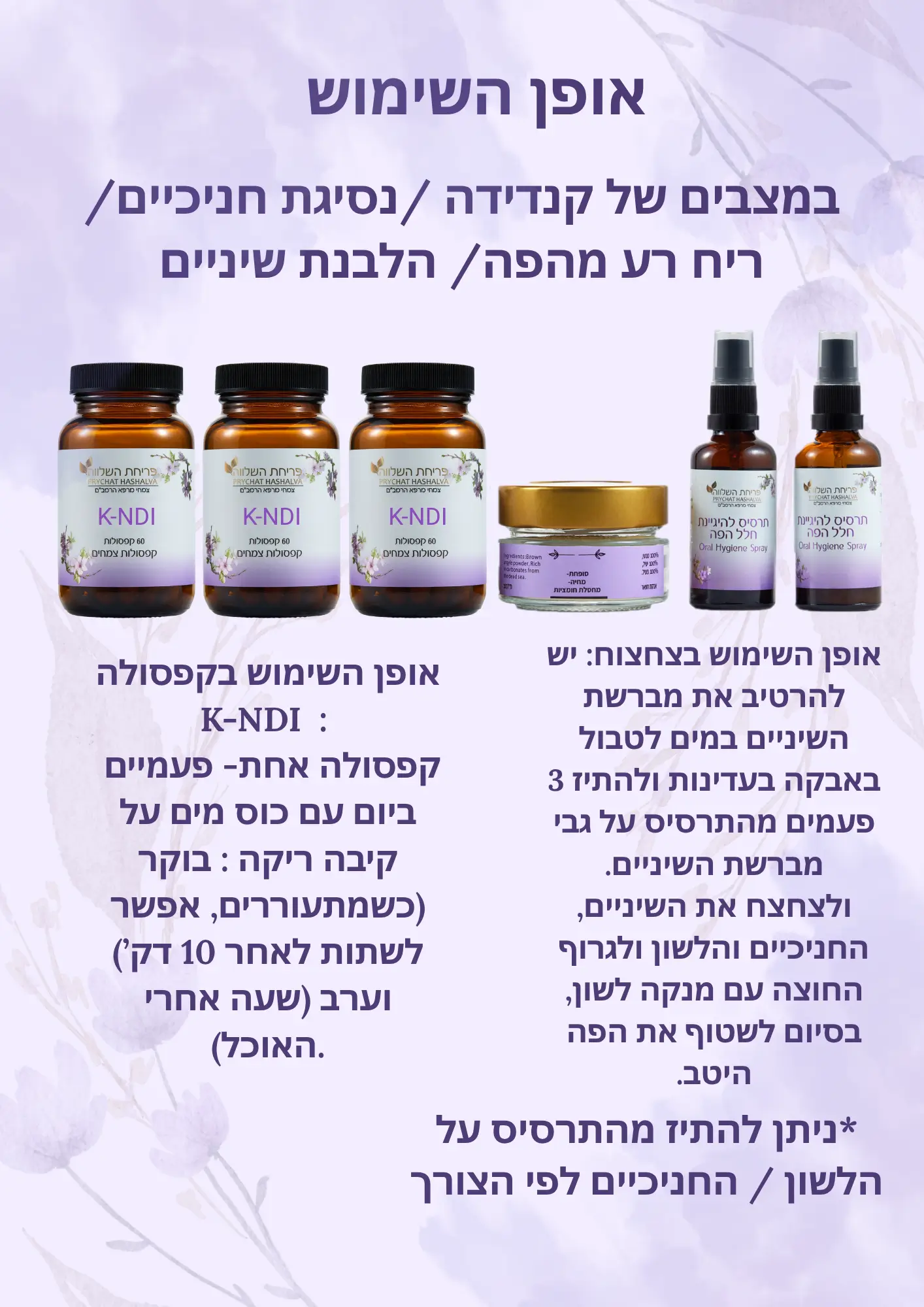 הכמוסה שמסייעת היא כמוסת הקנדי K-NDI. מומלץ לשלב עם אבקת חוואר ועם התרסיס להיגיינת חלל הפה, טבלו את המברשת באבקת חוואר בעדינות, התיזו פעמיים מהתרסיס וצחצחו כך פעמיים ביום.