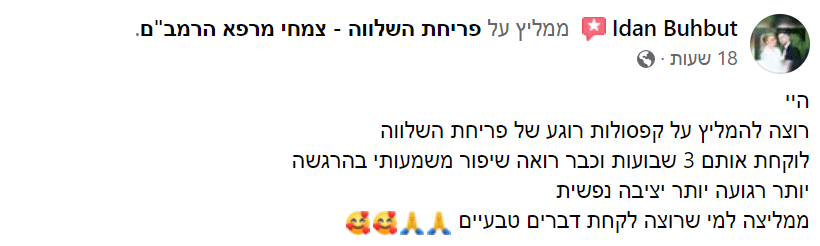 "רוצה להמליץ על הקפסולות של פריחת השלווה, לוקחת אותם כבר 3 שבועות וכבר רואה שיפור משמעותי בהרגשה, יותר רגועה, יותר יציבה נפשית. עידן ב."